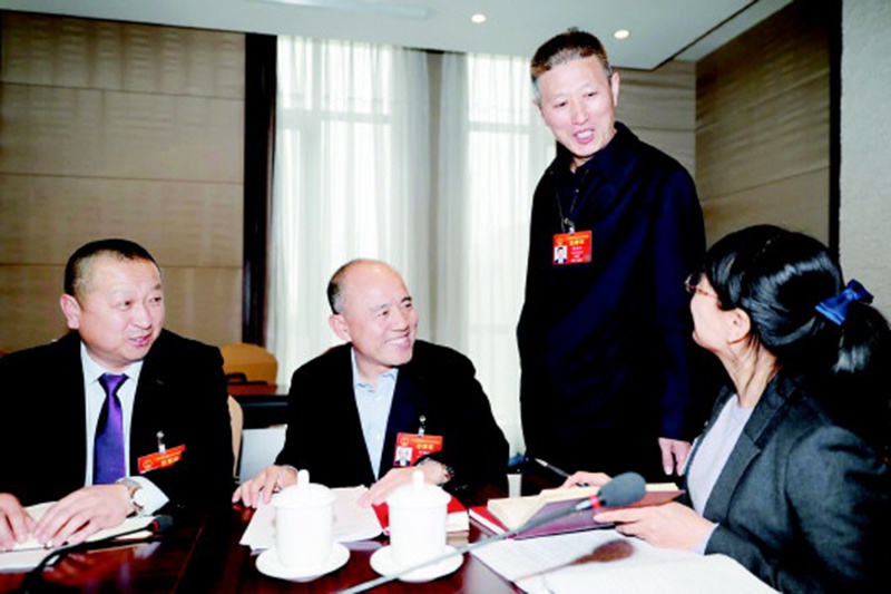 3月9日,山東代表團(tuán)周建軍(左一)、周洪江(右二)等代表討論宮明杰代表(左二)提出的提高經(jīng)濟(jì)作物種植機(jī)械化程度的建議。
