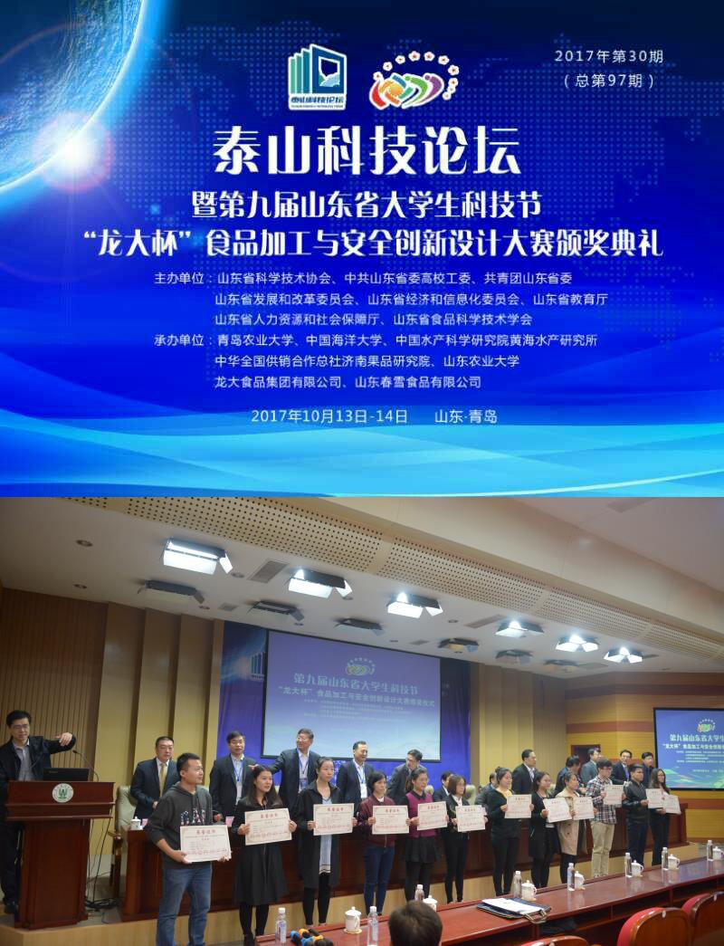 10月14日,泰山科技論壇暨第九屆山東省大學生科技節“龍大杯”食品加工與安全創新設計大賽頒獎典禮在青島農業大學舉行。龍大食品集團有限公司參與承辦此次活動,旨在激勵大學生的創新創業意識,發掘、培養應用型人才,并為他們提供創新創業平臺。